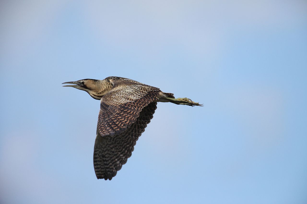 Podczas lotu Bąk wydaje pojedyncze albo powtarzane ochrypłe i gardłowe „graoh”.